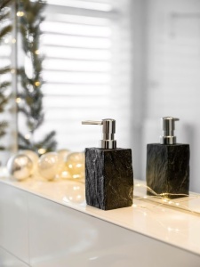 Un ansamblu de contraste - linii drepte combinate cu un aspect robust de piatra naturala caracterizeaza seria de baie Slate Rock. Utilizarea materialelor de inalta calitate, cum ar fi polirasina cu aspect de ardezie, confera elementelor din serie un aspect elegant, natural. Dispenserul practic de sapun poate fi umplut individual cu pana la 250 ml de sapun lichid sau lotiune de spalat. Cantitatea dorita de sapun sau lotiune este pompata prin apasarea usoara a butonului de dozare.