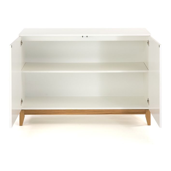 Bufetul inferior Blanco, cu o latime de 120 cm, este realizat din MDF si lemn, combinand armonios finisajele alb si maro. Designul sau modern si functional ofera spatiu generos pentru depozitare, fiind perfect pentru sufragerie sau bucatarie. Finisajele elegante si liniile curate adauga un plus de stil si rafinament oricarui interior.