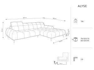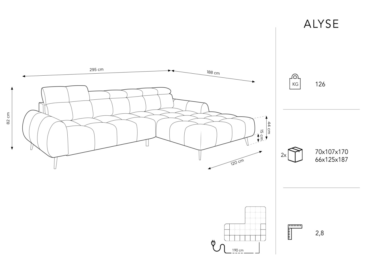 O canapea de colt moderna si functionala, cu un sezut retractabil electric. Cu ajutorul acestuia, puteti mari suprafata canapelei cu pana la 25 cm si puteti obtine un spatiu de sedere suplimentar. Mecanismul necesita conectarea la priza prin intermediul unui cablu (aprox. 1,9 m, inclus). Se activeaza cu ajutorul unui buton de langa cotiera. Exceptionala canapea de colt Alyse combina designul si functionalitatea unice cu tehnologii inovatoare. Sezutul sau extensibil electric reprezinta o solutie intriganta. Este suficient sa apasati butonul de la nivelul cotierei pentru a largi suprafata canapelei cu 25 cm si a va bucura de spatiul de odihna suplimentar. Mobilierul iese in evidenta datorita tapiteriei matlasate unice, a scaunelor adanci si a sezlongului spatios. Spatarele sunt foarte confortabile, iar pozitionarea lor poate fi reglata in functie de nevoile dumneavoastra. Corpul canapelei este completat de cotierele profilate si late si de picioarele inalte.