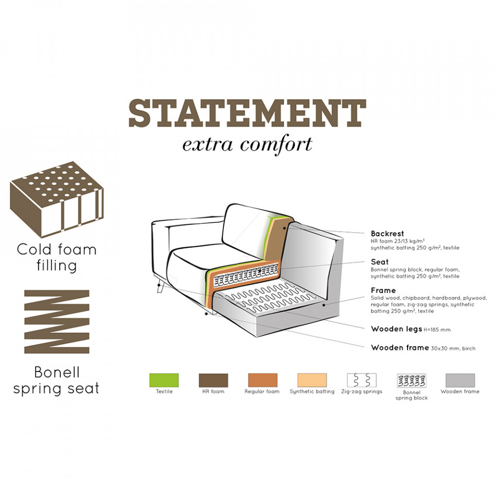 Material: catifea din poliester, lemn de mesteacan, placaj si PAL, umplutura din spuma poliuretanica cu 23-25 kg/mc